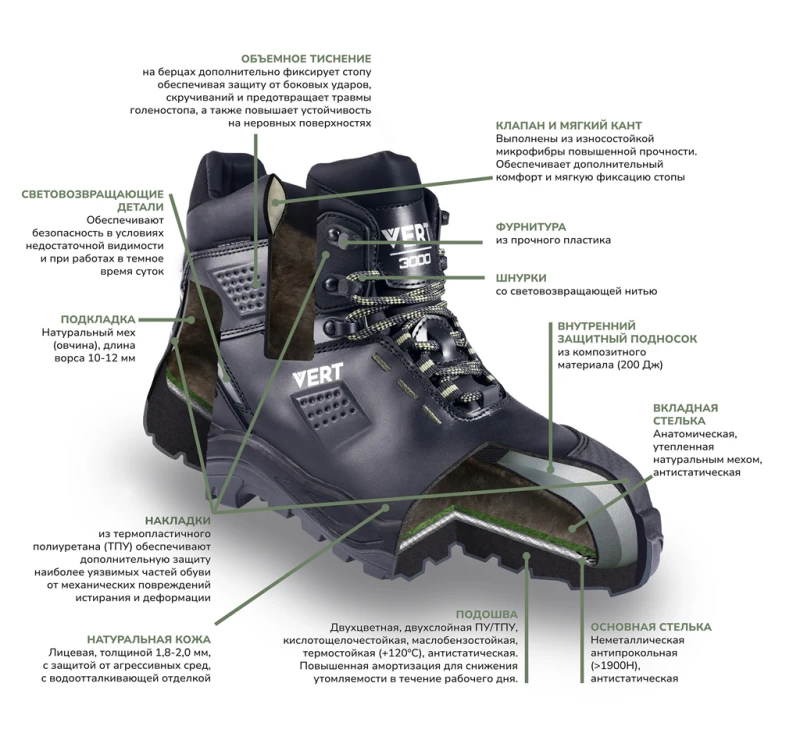 Обувь серии VERT 3000 — безупречное сочетание стиля, комфорта и современных технологий! Коллекция отличается стильным дизайном, использованием высококачественных современных материалов и уникальной колодкой повышенного комфорта. Анатомическая стелька помогает минимизировать утомляемость и обеспечивает отличную поддержку стопы даже при длительной носке. Обувь серии VERT 3000 гарантирует надежную защиту от агрессивных сред и механических воздействий, что делает ее идеальным выбором для работы в самых разных отраслях промышленности. Высокие стандарты качества и технологичные решения обеспечивают безопасность и комфорт в любых условиях. VERT — защита и стиль без компромиссов! Состав материалов: -Верх: натуральная гладкая лицевая кожа (толщина 1,8 - 2,0 мм). -Клапан-язык: глухой из микрофибры, с водоотталкивающей пропиткой и с полиуретановым покрытием, продублирован поролоном. -Мягкий кант: из микрофибры, с водоотталкивающей пропиткой и с полиуретановым покрытием, продублирован поролоном. -Материал утеплителя: на