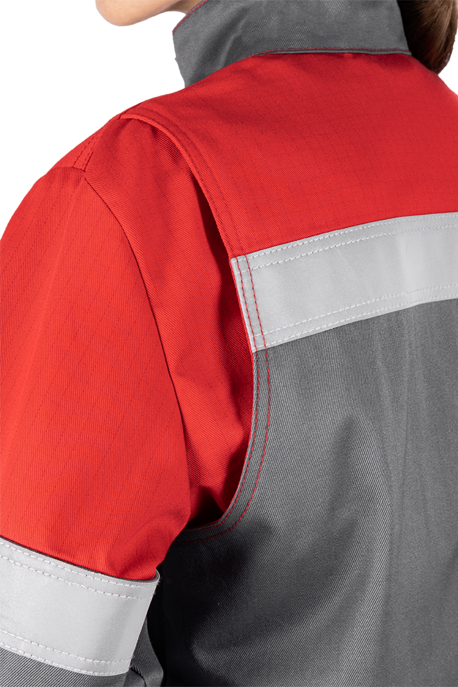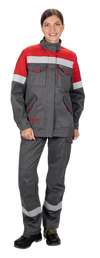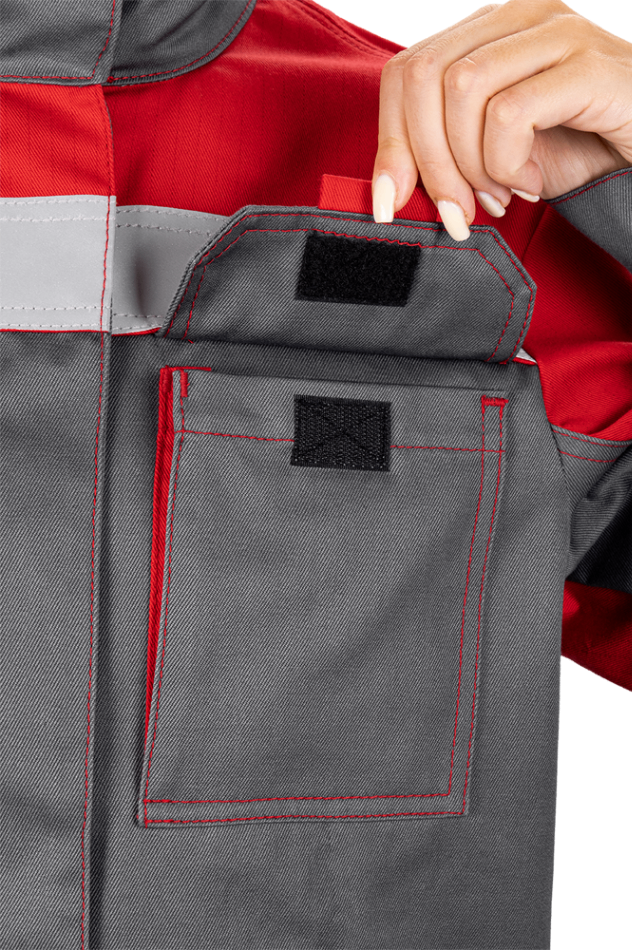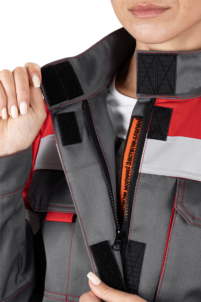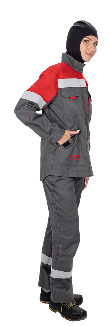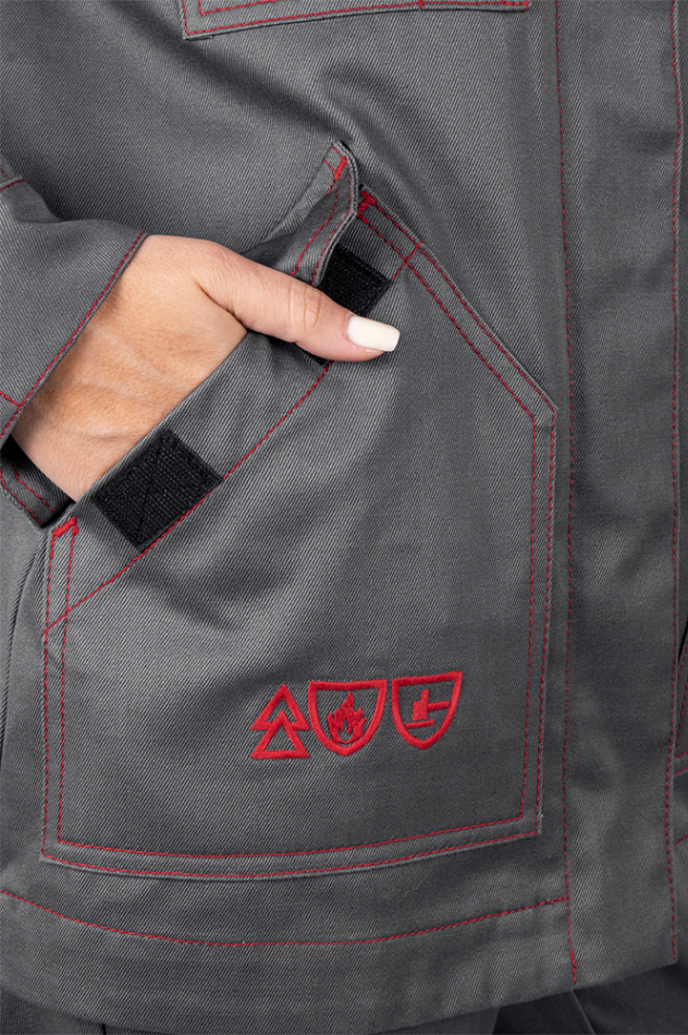 Уровень защиты: 3 То -(А1 и А2) от кратковременного воздействия открытого пламени Тт (уровень защиты В1) – защита от повышенных температур, от конвективной теплоты Ти (уровень защиты С1) – защита от повышенных температур, от теплового излучения Эс - от статического электричества Ми – защита от механических воздействий, истирания З – защита от общих производственных загрязнений Материал: огнезащитная ткань WORKER 265E Состав: 87% хлопок / 12% нейлон / 1% антистатическая нить, плотность 265±5% г/м2 Комплектность: куртка, брюки. Куртка прямого силуэта, с центральной бортовой застежкой-молнией, с цельнокроеной планкой с застежкой текстильной. Воротник - стойка. Ветрозащитная (внутренняя) планка имеет шевроном с напоминающей информацией «Застегни молнию! Застегни клапан!» Полочка с верхним и нижним накладными карманами с клапаном с застежкой. Правый верхний накладной карман имеет дополнительное отделение. По шву притачивания кокетки спинки и полочки ра