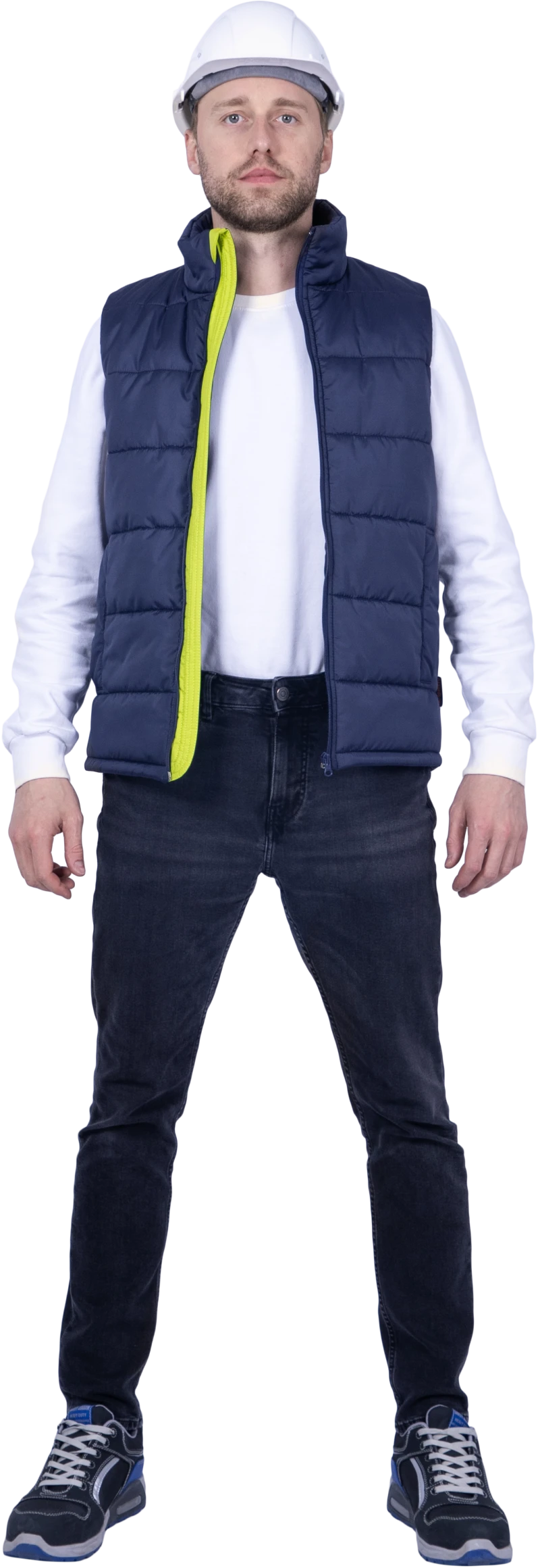 Ткань верха: «Дьюспо», отделка ВО (RW), PU MILKY Состав: 100% полиэфир, плотность 90 г/м² ТР ТС 017/2011 ГОСТ 25295-2003 Жилет: • прямой силуэт • центральная застёжка на молнию • внутренняя ветрозащитная планка лимонного цвета • боковые прорезные карманы с листочкой с застёжкой на потайную кнопку • воротник-стойка с отделочной деталью лимонного цвета